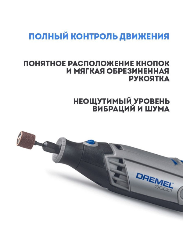 Хотите работать максимально эффективно - выбирайте компактный и скоростной многофункциональный инструмент Dremel. Хорошая эргономика и неограниченные возможности по обработке материалов впечатлят каждого. Гравер Dremel 3000 действительно универсален и идеально подойдет для несложных бытовых задач и проектов. ОСОБЕННОСТИ: оптимальная мощность в 130Вт, удобная регулировка скорости, мягкое покрытие для гашения вибрации, система быстрой замены оснастки. С помощью спец. насадок можно резать металл, фрезеровать древесину, делать гравировку на стекле или камне, зачищать поверхность от мелких повреждений или старого покрытия. В каталоге представлено два варианта по комплектации. Модель Dremel 3000-15 (в сумке) укомплектована 15 различными насадками. Модель 3000-1/25 идет в кейсе с 25 насадками, дополнительно прилагается гибкий вал (225) и удобный пластиковый держатель для крепления к стене и намотки шнура. СОБЛЮДАЙТЕ ПРАВИЛА: 1. Перед началом убедитесь, что выбран нужный держатель, и он надежно закреплен в патроне. 2. Соблюдайте скоростной режим для обработки конкретного материала (например, металл / дерево - до 35000об/мин, пластик - до 15000об/мин). 3. Надевайте защитные очки. Прямошлифовальная машина Dremel поставляется в коробке, дополнительно прилагается инструкция и заполненная гарантия.