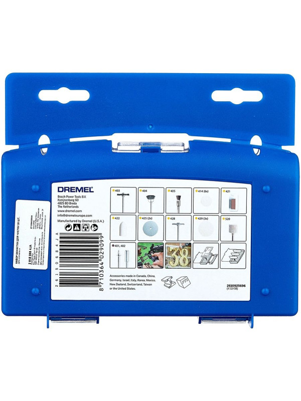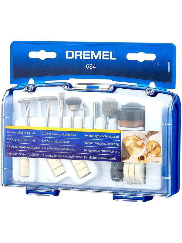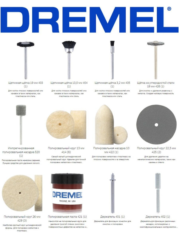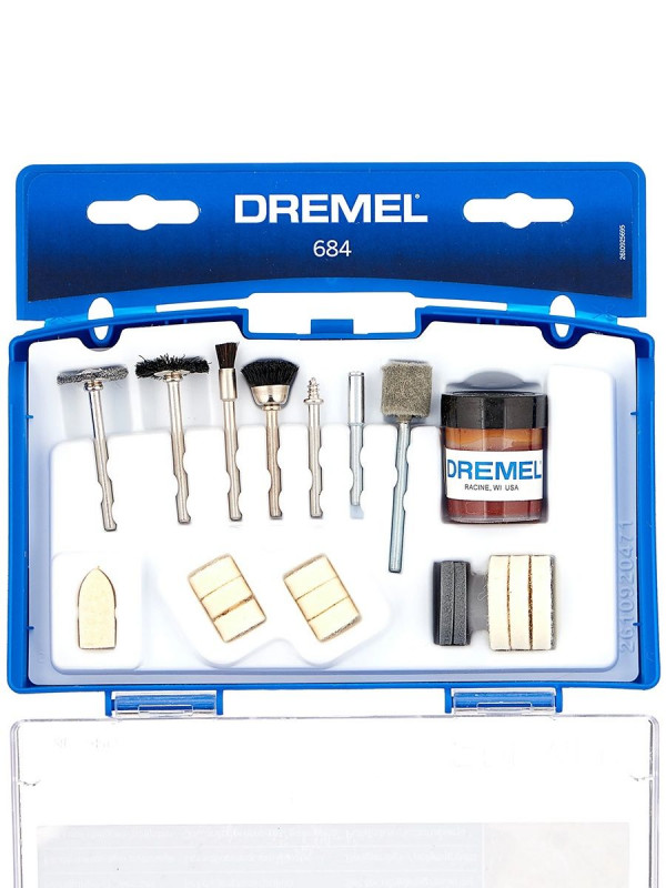 Выбирайте Dremel 684 (20 предметов) или Dremel 687 (52 предмета), чтобы оценить на деле универсальные наборы насадок для гравера. Фирменный кейс удобен для хранения и не займет много места. Нужная насадка будет всегда под рукой! Наборы для гравера многофункциональны и предназначены для полировальных работ по металлу, пластику, чугуну, пригодятся для зачистки и снятия отделочного покрытия. В каждом наборе есть специальная паста для устранения мелких дефектов (патина, царапины) и два держателя для быстрой установки насадок на бормашину. СОБЛЮДАЙТЕ ПРАВИЛА: 1. Перед началом убедитесь, что держатель надежно закреплен в патроне. 2. Начинайте работать сразу на высокой скорости, рекомендованной для обработки конкретного материала (например, металл - до 35000об/мин, пластик / стекло - до 15000об/мин). 3. Надевайте защитные очки. Выбирайте полноценный комплект с зачистными щетками, полировальными дисками для гравера и справляйтесь еще эффективнее с любыми задачами. Наборы DREMEL 684 / 687 допустимо использовать с многофункциональным инструментом других производителей.