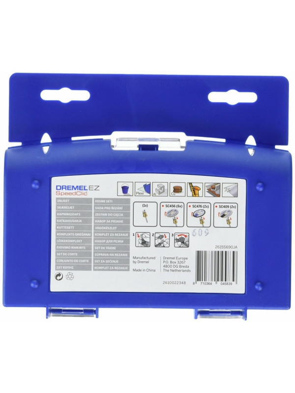 Ассортимент включает в себя 10 отрезных кругов EZ SpeedClic и специальный держатель EZ SpeedClic. Помимо 6 обычных металлических отрезных кругов диаметром 38 мм в набор также входят 2 специальных тонких отрезных круга и 2 уникальных круга для резки пластика. EZ SpeedClic - это уникальная система для быстрой смены насадок роторного инструмента. EZ SpeedClic. Быстро, просто, легко.