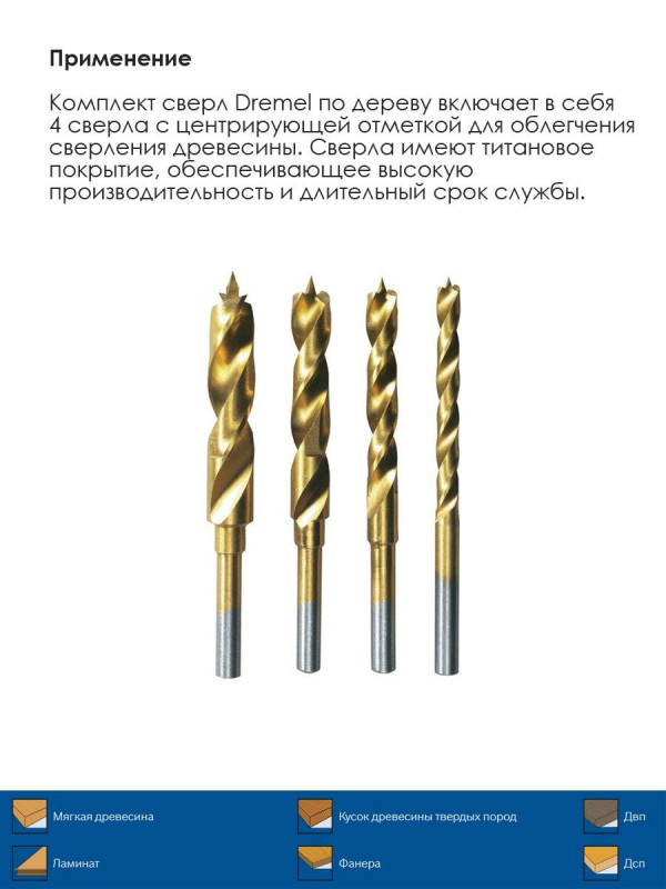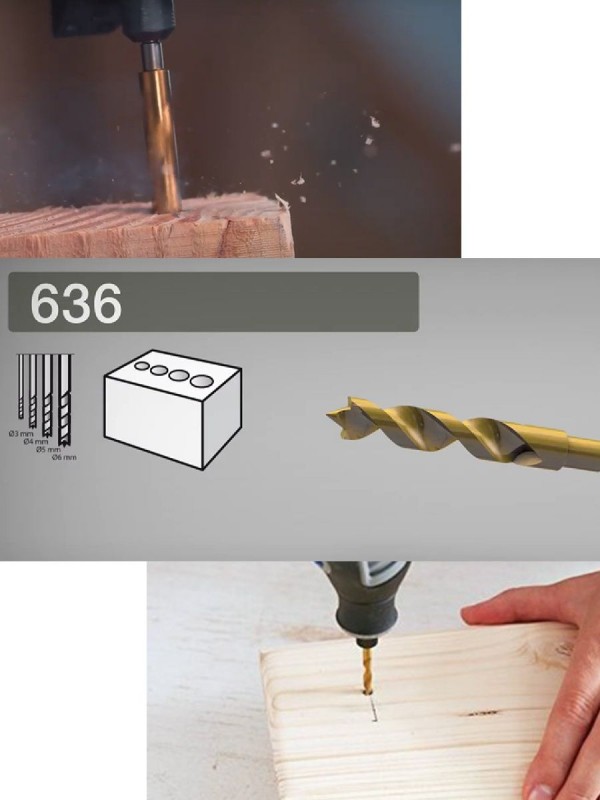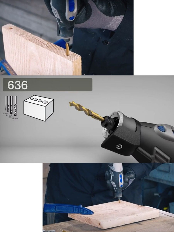 Наборы сверл Dremel предназначены для точных работ по мягким материалам. В каталоге представлено 2 комплекта: Dremel 628 (универсальные сверла) и Dremel 636 (сверла по дереву). Универсальные сверла Dremel 628 отлично сверлят дерево, пластик, ламинат, также подойдут для алюминия и латуни. Главное, соблюдать рекомендованный скоростной режим (подробная информация указана на обороте упаковки). Всего 7 СВЕРЛ с диаметром 0.8, 1.2, 1.6, 2.0, 2.4, 2.8, 3.2мм. ОСОБЕННОСТИ: изготовлены из качественной стали, посадка - цилиндрический хвостовик, спиральная форма, max скорость - 35000об/мин, точное сверление под углом 90°. Набор #636 предназначен для сверления древесины, ламината, фанеры, ДСП и ДВП. В комплекте 4 СВЕРЛА с диаметром 3, 4, 5, 6мм. ОСОБЕННОСТИ: изготовлены из качественной стали с титановым покрытием, ц/х, отличительная спиральная форма с центрирующей отметкой, max скорость - 35000об/мин. Совместимые модели многофункционального инструмента DREMEL указаны на фото. ДОПОЛНИТЕЛЬНО: для работы со сверлом для реноватора можно приобрести кулачковый патрон №4486 и рукоятку №577. Поставляется набор сверл Dremel в прочном пластиковом кейсе.